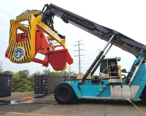 “盒子”以安全可靠的科尼Liftace 4532 TCE5正面吊為基礎(chǔ),增裝采用鋼材和組件制作的翻轉(zhuǎn)吊具,可以實(shí)現(xiàn)整箱360度翻轉(zhuǎn),每次翻轉(zhuǎn)設(shè)計(jì)安全起重重量高達(dá)35噸,滿足多數(shù)搬運(yùn)場(chǎng)景,確保了在要求苛刻的散貨碼頭/鐵路沿線環(huán)境中具有可靠的性能,重新定義了散裝貨物的搬運(yùn)之道。